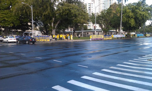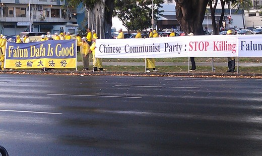 出席亞太經合會的大陸領導人胡錦濤,今天上午抵達檀香山。街頭人行道上,已經有法輪功的修行者拉布條抗議!