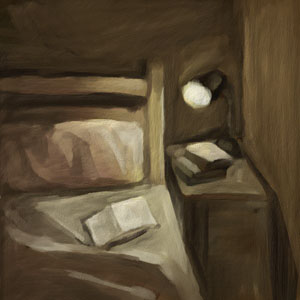我伸手轉動門把,向右,開了。嚴格地來說,門在我轉動的那一秒像分子般被捲入門後的黑暗,徹底地消失在我看得見的空間。面前是比我處的黑暗還更幽暗的地方,像一個無底洞。由混沌的空氣組成。我往前踏一步,不知道是被什麼所驅使,但就像是既定的規則,或是宿命,我就是該往前踏,即便我完全無法預測。