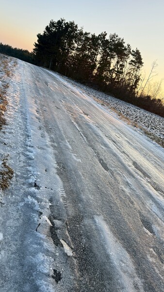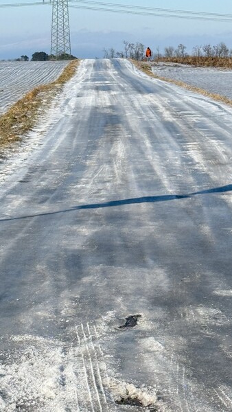 在這裡6:00 開車出門天還黑黑的,這條鄉間小路竟未剷雪, 開了一公里, 前面一輛車已經不能動彈了, 直閃警告燈, 我等了2分鐘,發現不對了。,無法前行, 只好退車,前面的駕駛慢慢走到我的車旁, 告知路太滑, 他被困住了, 等待救援…