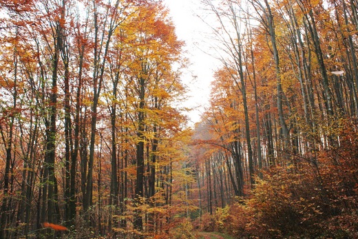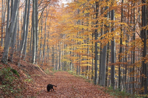 十一月的森林是金黃色的,落葉像雨般的從樹梢飄落下來, 下<<樹葉雨>>好美ㄚ; 沒有錯過冬天來臨前的美景,真幸運! 老師說:金色界代表文姝師利菩薩智慧之明,眼前的一切景色應是菩薩降臨於大地, 賜予一切有情眾生金色之花. 帶著小比利散步在林間, 幾個月前還擔心小狗活不下來,為了復健走向山來; -- 真是我佛慈悲-- 比利復元的很好雖然身體裡仍有兩支墊片,右後腿仍有問題, 但是已讓我感到小狗重生的喜悅.