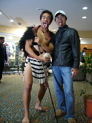 我剛才想的:「「這團怎麼一開始就那麼不順利!」果然…。也不知道為什麼,這好像是慣例一樣,團體一剛開始不順利,整團就會不順利,往後的幾天大大小小不順利的事接二連三的出現,車子拋錨、客人走丟、東西不見,最慘的是每天都在下大雨,甚至是暴風雨,因為暴風雨而使得很多行程都不能走。還好可能是因為阿公阿媽的關係,看的比較開,反而是我自己覺得很嘔,也是我第一次帶團帶的那麼不順利。後來返回基督城,我就到教堂裡祈禱了一下,祈禱說:「上帝ㄚ!我希望之後的行程能順利一點,天氣能好一點。」那天下午我們又搭機從基督城飛回北島的另一個城市---羅吐魯瓦,這是一個著名的溫泉城市,也有著名的紐西蘭原住民—毛利人,飛機一抵達後,天ㄚ!當地的天氣好到不行,湛藍的天空又不會熱,跟之前南島那種豪雨濕冷的天氣完全不一樣,一下機就有毛利人最著名的打招呼方式”鼻子碰鼻子”,這團阿公阿媽害羞的不敢跟毛利人碰鼻子,大伙就起鬨要我先碰,整個團體的氣氛跟在南島時完完全全的不一樣,好像換了一團似的,從天氣變好、司機像聖誕老公公一樣、行程順利到甚至多好幾個行程,整個團體不像在南島時那樣的死氣沉沉的。在要回國的前一天,我把對這團的心情告訴這群可愛的阿公阿媽:「很抱歉!我沒有辦法控制天氣,我在出國前有去拜拜,可是在南島時每天下暴風雨,導致行程非常不順利,我在這跟各位說聲抱歉。」一個全程跟我還不錯的王阿公就半開玩笑的說:「丟嘛!嚨死哩啦,出茍沒塞拜佛主,愛拜亞蘇,哩摸聽貴,南”無”阿彌陀佛嗎?(對嘛!都是你啦,出國不能拜佛主,要拜耶穌,你沒聽過,南”無”阿彌陀佛嗎?)」我額頭出現三條線,心想這是腦筋急轉彎嗎?好前衛的阿公ㄛ。他一說完,全團的阿公阿媽笑個不停,