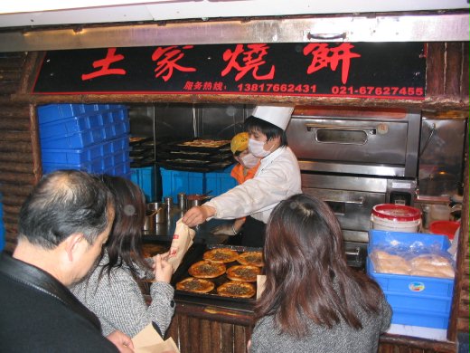 圖二. 轉到西藏路, 見一大群人在一家小店面前排隊. 原來是為了買土家燒餅 (廣告上自稱 "中國式 pizza"). 我被人氣感染, 也跟著排隊買了一個. 果然熱騰騰的, 餡香而皮軟, 非常好吃 (如今仍念念不忘).