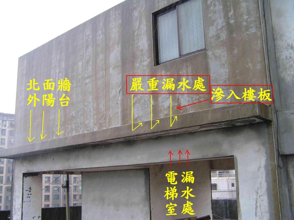 1.上次電梯室的防水工程,廠商只是用一層三夾板或塑膠板包在外牆,再用一些塗料固定。但是板子與板子之間的縫隙沒有用防水材料確實填補,才會造成雨水從縫隙間滲入內牆,再由內牆滲入電梯頂面的樓板,所以水才會漏進電梯裡面造成短路。而電梯室天花板的漏水,更顯示廠失所用的板子並未達到防水的功能。