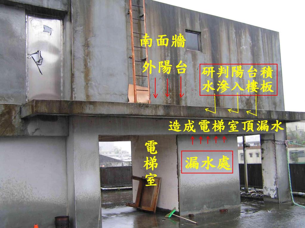 3.建議一:重新檢查原來的防水工程是否確實,並將電梯室南北面的外陽台做斜坡以便排水。