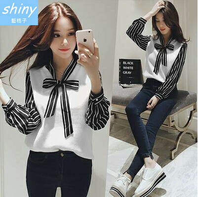 None, ~399超商免運 599折30 輸入代號 M7OJ-IPQJ-ZB18-R5YO【V1431】shiny藍格子-巧思美形.條紋拼接蝴蝶結長袖上衣。在樂天市場的shiny藍格子有最棒的商品,是您省錢的最佳選擇。