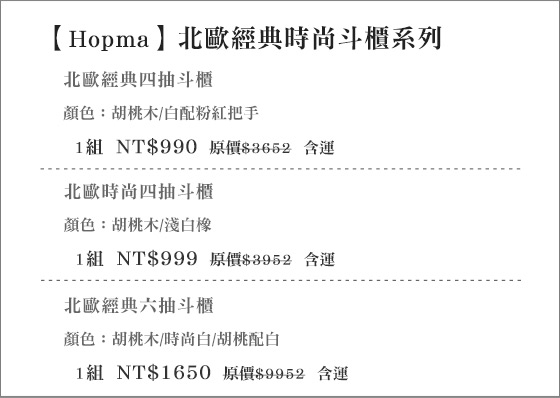 商品訊息簡述: 只要990元起(含運)即可購得【Hopma】原價最高9952元北歐經典時岸磏d系列1組:(A)北歐經典巧滮磏d,顏色:胡桃木/白配粉紅把手/(B)北歐時岩抽斗櫃,顏色:胡桃木/淺白橡/(C)北歐經典六抽斗櫃,顏色:胡桃木/時岩?胡桃配白。