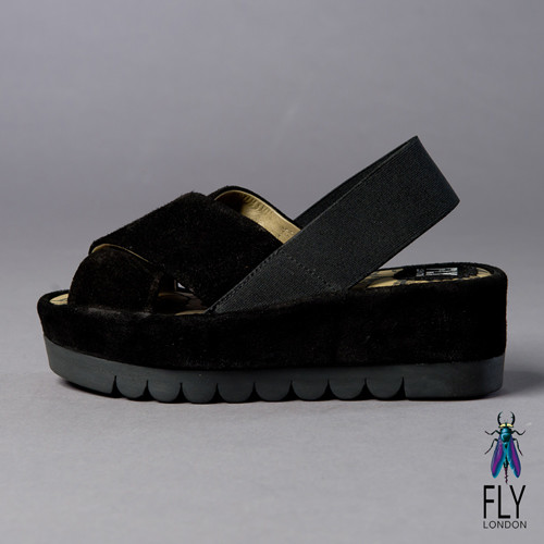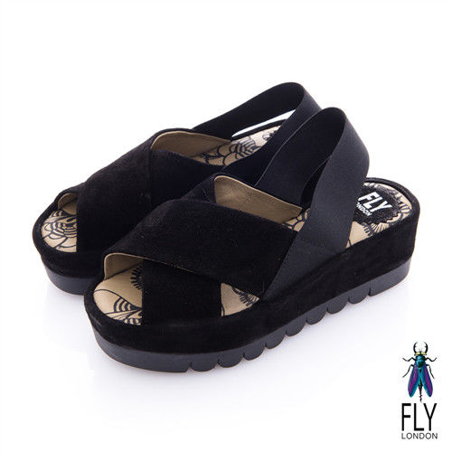 Fly London(女) FAYA 時尚麂皮交叉厚底涼鞋-黑好用