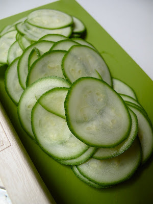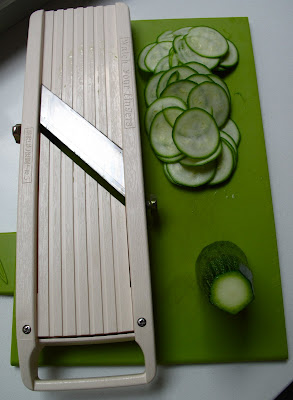 (中文好像叫做蔬菜處理器,但好像有點怪?!)刨成薄片,在盤子上一一排好,淋上少許橄欖油,灑上現磨黑胡椒和磨成粉的起司。放著等節瓜軟化一點,約5分