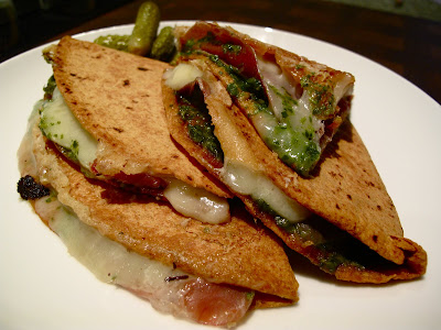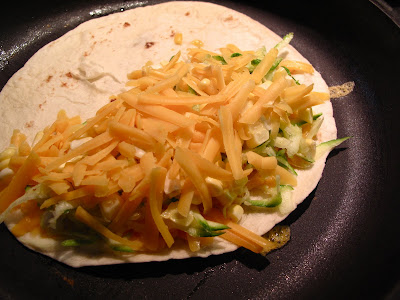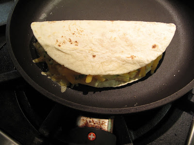 墨西哥烤餅 (Quesadilla) 是墨西哥料理的小食,只需要基本的幾種材料,就可以做出很多變化。大概的做法是,先將一片墨西哥薄餅 (tortilla) 在平底鍋上煎一下,只要煎一面就好,(要不要用油都可以,但我通常都沒有用),在一半的麵餅上灑上起司絲,放入你要用的材料,最後再灑上一點起司,然後將薄餅蓋上,用小火煎,等到底下的起司融化之後,把半圓型的烤餅翻面,繼續用小火,煎到起司完全融化為止。