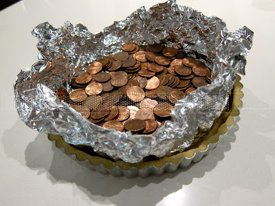 這時一般看到的食譜都是用 pie weight, 乾的豆子(任何一種都可以)或是米粒,但是之前在紐約時報的影片中看到用零錢當 pie weight,啊,好聰明啊,因為零錢是銅做的,傳熱效果一定比較好,試了一次,果然,效果很不錯,下次你如果要做派或是塔的時候,一定要試試這個方法。