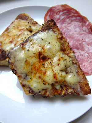 按照平常的做法做,將麵包泡在牛奶和蛋汁裡(不要加糖喔),然後用一點點奶油或是沙拉油煎到麵包熱透。灑上喜歡的起司和一點點辣椒粉和現磨黑胡椒,然後進烤箱烤一下(我是用上火 broil setting),烤到起司變軟融化就 ok 了。 |
