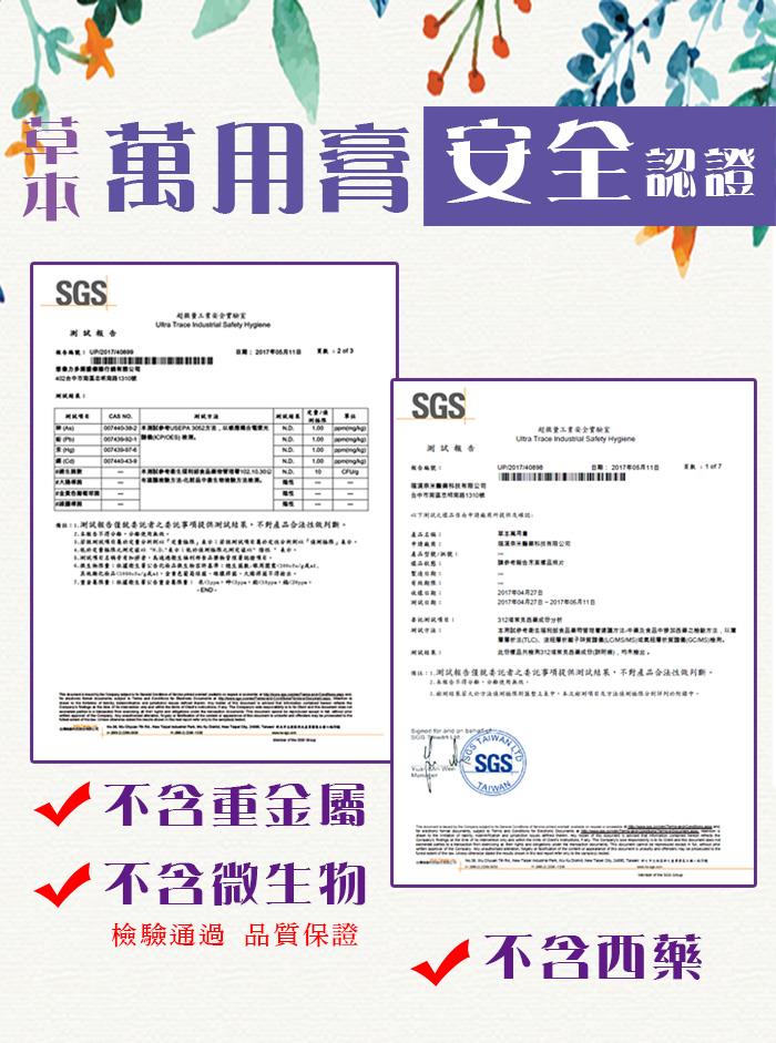 適合刮痧或推拿後能保護肩頸細嫩的肌膚 水性乳膏 易清洗 不殘留於衣服或身體表面 SGS檢測 不含重金屬 微生物及312項西藥 主商品 衛元堂草本萬用膏 50ml 5 5成份
