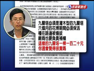 台北市府發言人趙心屏舉例表示,花博契約規定的廿元空心菜,規格必須符合直徑廿公分、高廿公分。一株契約規定四十九.九元的茭白筍也必須符合直徑廿公分、高六十公分的規格。至於外界批評一棵兩百元的九層塔,實際單價是五十元,而且是直徑十二.七公分、高五十公分以上的灌木型九層塔,不是一般食用的九層塔。