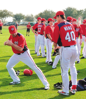 國民隊投捕手練習開始前,大伙兒在草地上聊天嬉鬧,等待著教練的到來。王建民可沒那麼清閒,他的課程早就開始了。
