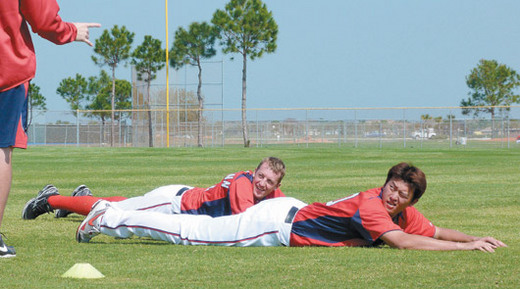 練投結束後,王建民(右)與隊友齊默曼進行體能訓練,累翻了。