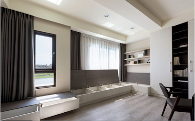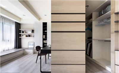 二樓是屋主的主要起居空間,採光較好的房間作為書房使用,窗邊臥榻下方藏著大量收納空間,拉開書桌旁的活動式門板,後方隱藏了一個偌大的更衣室,開放式收納讓所有衣物一目了然,更方便拿取。