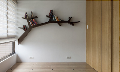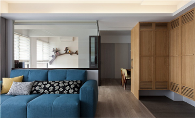L 型的天然紋路褐色木櫃,緊貼著牆面減少了空間使用,懸空的櫃體展現輕盈的量體感,多容量的收納鞋櫃賦予高 CP 值;沿著輕淺暖色的地坪,來到居家空間中,感受到明亮的採光洗禮,看見電視牆以溫潤的層板製作而成的展示架、與收藏書籍的書櫃,構築出自然況味的居家空間;靛藍的沙發成為吸睛的焦點,放置在溫和的木工設計之中,創造出不失活潑的家具配置;沙發後方為半開放式的書房兼具多功能室的空間,如欲使空間具有穿透性,可將窗簾收起露出透明的窗玻,並開啟活動拉門,便能展現出開放格局的遼闊感,同時也可以彈性使用,將空間內的和室作為客房使用,造型的樹枝書架,讓牆面型塑出生動的一面;起居空間則簡化設計,強調舒適的休息場所,運用沉穩的衣櫃設計搭配明亮的視野,營造休閒紓壓的空間氛圍。