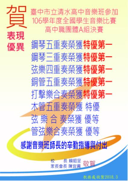 賀臺中市立清水高中音樂班參加 106學年度全國學生音樂比賽 高中職團體A組決賽,表現優異,共獲得六項特優(其中五項第一)
