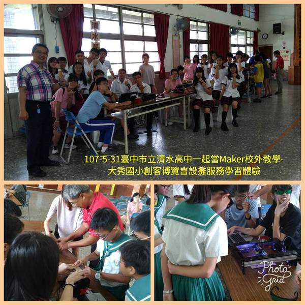 107年5月31日臺中市立清水高中高一多元選課一起當MAKER課程,適逢107年臺中市國民小學反霸凌SCRATCH菁英邀請賽暨機器人趣味遊戲觀摩活動,任課教師翟家甫主任特地規畫參與創客博覽會活動,帶領學生進行校外教學,前往清水區大秀國小設攤。本次活動目的除了藉此機會宣傳本校創客教育之成果之外,更希望讓每一位同學能夠擔任指導者,指導民眾如何完成體驗,了解服務學習的真諦。透過經驗交流與教授,豐富本校多元選修特色課程。