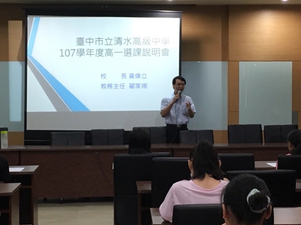由於高一同學第一次接觸自行選課,學校特別安排8月10日分別於第一會議室及禮堂舉辦兩場選課說明會,由黃偉立校長主持,教務主任與地球科學周漢強老師分別說明學生如何選課及課程摘要介紹。尤其學校特別精心規劃兩階段選課,第一階段提供選課意向書,希望對於某項課程有強烈選讀意願同學,可以透過選課意向書,由任課教師進行篩選;第二階段才是由同學線上選課,再由電腦分配。種種做法,都是希望能夠讓學生選到心目中理想的課程。