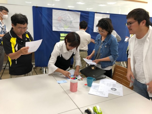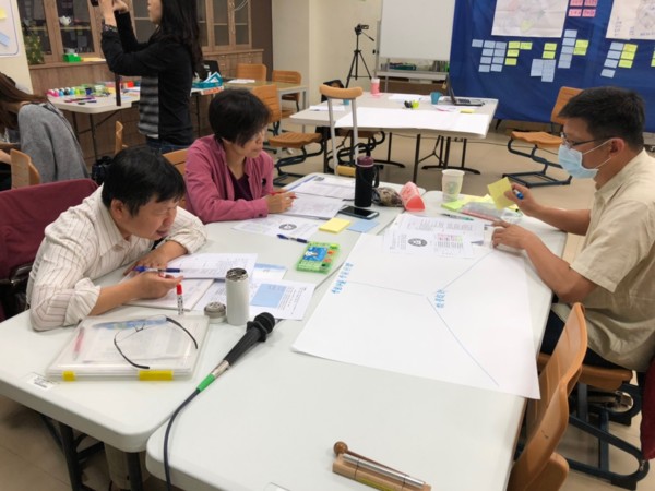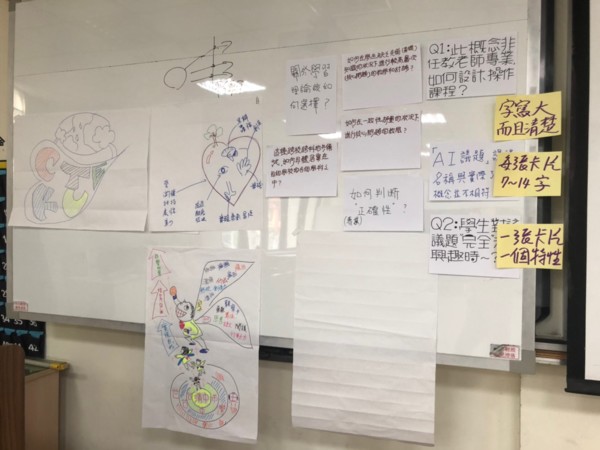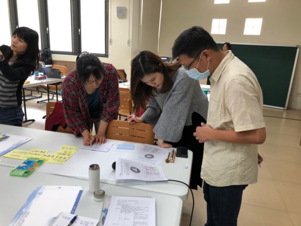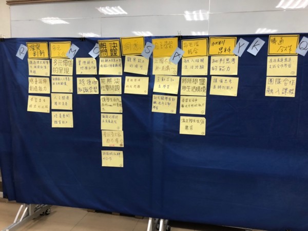 第一天研習,講解素養導向課程素材發想,進行一場腦力大激盪,素養是108課綱的課程發展主軸,如何將素養帶入課程中呢? 若以老師為主的課程安排,就會是以知識科目排課;但是以學生為主的學習,就必須從學生好奇的問題進入。工作坊一開始先讓各科老師分別討論身為教師的我們期待學生具備什麼素養呢?透過跨領域的對話與分享,鼓勵各科教師之間互相交流。接著各科老師將自己沉澱下來,檢視自己的課程是否對應校本核心素養,思考課程想要解決的核心問題是什麼?從設計理念、學習目標以及教學設計的角度出發,與自己的領域夥伴一起討論還需補充哪些校本核心素養。最後在海報上所呈現的內容包含一開始討論期待學生應具備的素養以及根據課程內容所補充的校本核心素養。在這樣的討論之下,各科教師除了希望將素養導入未來的課程,也是希望培養學生帶著走的能力。