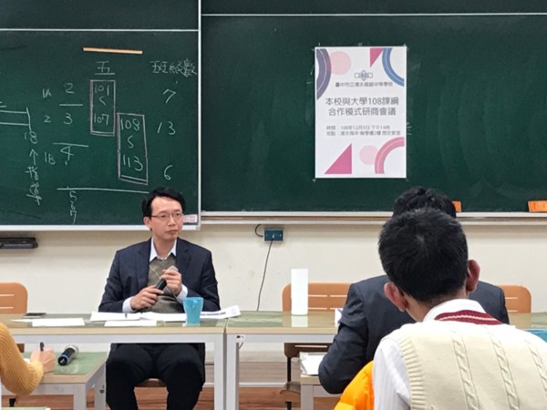 108-12-5下午,臺中市立清水高中為了推動新課綱,提供學生更優質的學習資源及教育環境,特別邀請亞洲大學、靜宜大學及逢甲大學等校,共同研商推動新課綱的可能合作模式,由黃偉立校長主持。會中邀請亞洲大學張祐誠副主任、靜宜大學沈碩彬助理教授及逢甲大學招生試務處譚靜芳秘書,分別帶領學校同仁與會。本校除了各處室行政主管外,各學科代表也應邀出席,希望共同來討論各種合作的可能方案。