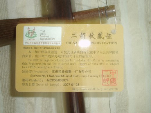 我説我這次是純脆來旅遊、也没想買什麼、幾天來在各地轉來轉去、東西都大同小異、連兵馬俑的記念土偶我都没什麼興趣、不購物就回西安市吧!就在車上突然想到二胡這樂器、問導遊小姐説有店家可買嗎、她説可問對人了、她自己在學琵琶、有琵琶老師熟著、可以請她幫我挑把好二胡、當下打手機連絡琵琶老師、約在西安文藝歌舞戯院旁的樂器行見面、由這位美麗的琵琶老師幫我挑上這把二胡、老師也當場應我的要求、秀了一段琵琶曲!