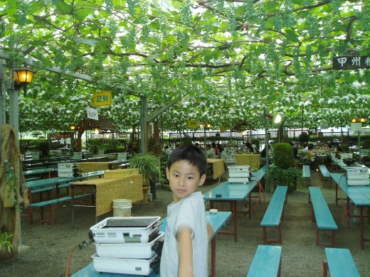 葡萄因最近日本天侯不好、蔔萄不如預期成熟、没能進入蔔萄園内摘著吃、只在葡萄藤下浅嘗小粒無子葡萄。