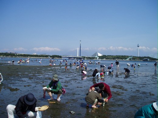 春天的脚歩蹣跚、一進一退的寒暖不定、難得今天是春日小和的好天氣、偕同一群朋友和小朋友到神奈川県金澤文庫、也就是有名的八景島附近、隨海潮的起伏在沙灘邊挖海瓜子(あさり)。從品川搭京浜急行線到金澤文庫站、快速車不到40分、再從車站走十五分鐘的路就到了。拜天氣晴和、海水温温的不冷、因是假日沙灘聚集了人潮、大家低頭用爬子努力的挖、海瓜子也布満淺淺沙中、只要輕輕得撥開沙子、必包你満手的貝殼、満載而歸!