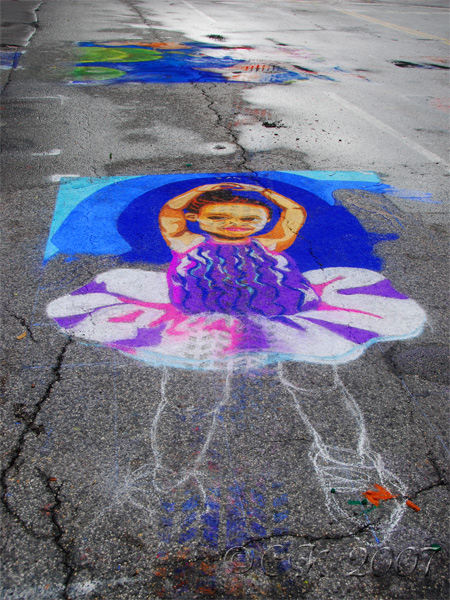 所以, 洛杉磯是舉行戶外活動的最佳地點, 因為會碰到下雨的機會很小. 可是, 那些未完成的畫, 怎麼沒被雨水沖壞, 反而顯的更鮮豔呢. 其實有一種粉筆是可以沾水畫的. 希望明年舉行時不會再下雨.