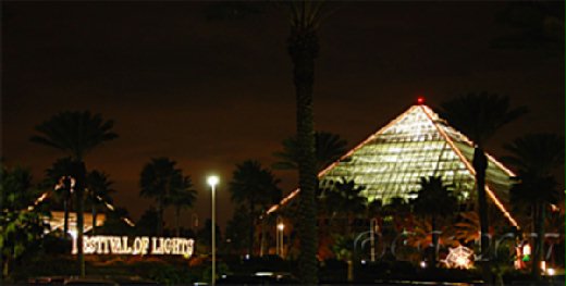 五彩的燈光假如有水面的倒影襯托一定是最美的,慕迪花園濱臨蓋文斯頓島海邊,在園內卻無法讓其入鏡,是一遺憾。反倒是回程時,行在高速公路上,隔海望向蓋文斯頓島上的慕迪花園的燈光,三個金字塔光耀寶石般的屋頂反映在海面上,呈現出美麗的水光一色,卻是今晚看到慕迪花園最美的燈光秀,可惜我無法停車,祇有將其印在腦海中帶回。
