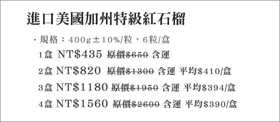 | 進口美國加州特級紅石榴-來自陽光加州的超級水果,璀璨紅寶石,果肉剔透飽滿、多汁芬芳,富含兩大抗氧化優質成分,女性天然養顏聖品平均每盒最低只要390元起(含運)即可購得進口美國加州特級紅石榴1盒/2盒/ 售價:390 我要購買 |