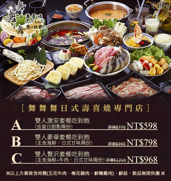 | 舞舞舞日式壽喜燒專門店-雙人套餐吃到飽-頂級日式壽喜燒超值吃到飽!獨家調製的醬汁與湯底,搭配彈嫩新鮮的肉品與清脆蔬菜,讓您吃得溫暖又飽足吃到飽!只要598元起即可享有【舞舞舞日式壽喜燒專門店】原價最高 售價:598 我要購買 |