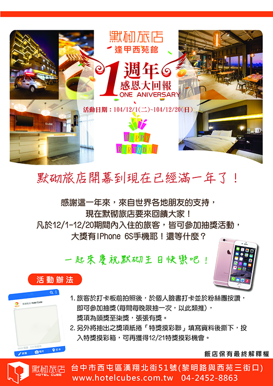 Hotel Cube- Care U Beyond Expectation 以服務為原生,一個善意對待的開始 默砌建立你我之間的默契旅途間心靈的橋樑 ![]() ![]() About Us 關於默砌 現代簡約的建築設計,受年輕人所喜愛的潮流風格,也是【默砌旅店】吸引旅客前來的原因。旅店鄰近逢甲夜市、國家歌劇院等熱門景點,交通往來方便。熱忱服務,視如家人般,將喜悅與幸福做為意念傳遞,旅居的這段時光裡,不光只是給予旅客有舒適住宿的場所,也有愉悅的交流,建立起與旅客之間的默契。 ![]() ![]() ![]() ![]() ![]() ![]() Room Type 客房介紹 典藏客房 默砌精心打造典藏客房21間房,每間客房皆有舒適柔軟的獨立筒床,配備自動空調溫控裝置、42吋液晶電視、國內外多頻道節目、全館無線寬頻上網、Mini Bar、貼心USB插座…等,為你提供優質的住宿環境。 ![]() ![]() ![]() ![]() 默砌客房(憑證使用,平日依房況可升等) ![]() ![]() Breakfast 自助早餐 用美好的早點開啟一日的起始。悠閒清淨的用餐環境,簡單卻健康十足的西式餐點,啜飲著咖啡、翻閱早報,所有瑣碎煩惱,都暫放一邊。 ![]() ![]() ![]() ![]() ![]() ![]() ![]() 臺中國家歌劇院 由2013年榮獲「普立茲克獎」的國際建築大師伊東豊雄所設計,58個曲牆單元組成空間,創造出幾近無直角的獨特洞窟建築,結合室內外空間,帶給視野不同驚奇。被外媒譽為世界九大新地標之一,獨創水幕消防設備與曲牆工法更贏得兩項世界專利。兼具理性與感性的文化地標,值得用耳朵傾聽,用心靈感受。 ![]() ![]() 逢甲商圈 逢甲商圈,位於臺中市西屯區逢甲大學周圍,屬商圈夜市類型。以文華路、福星路為核心的區域,另外延伸走進文華路可達逢甲旗艦夜市,目前是臺灣規模最大的夜市;在交通部觀光局「2010年特色夜市選拔活動」中,因逢甲夜市的創新、多元的美食小吃,所以與基隆廟口夜市共同取得「台灣最美味夜市」頭銜。 ![]() 勤美誠品綠園道 勤美天地位在台中市公益路與經國綠園道旁的購物中心。由勤美集團與誠品集團共同招商組成結合人文、藝術、觀光與生活機能的購物中心「勤美誠品綠園道」。知名建築師陳瑞憲與郭旭原將大樓重新改裝設計,室內植生牆共13200株植栽,由地下2樓延伸至地上3樓(高達20公尺);室外植生牆共118300株,當時為亞洲最大的植生牆。 ![]() 國立美術館 民國77年開館的國立台灣美術館位於台中市西區,毗鄰台中市立文化局與國立自然科學博物館,是目前亞洲最大的美術館。國美館的外觀以整片天然石片鋪上,館外草坪放置巨型雕塑,大片的綠地往往吸引許多民眾此席地而坐,愉悅地聊天、曬太陽,構成一幅悠閒自在的畫面。 ![]() 交通資訊 ![]() |