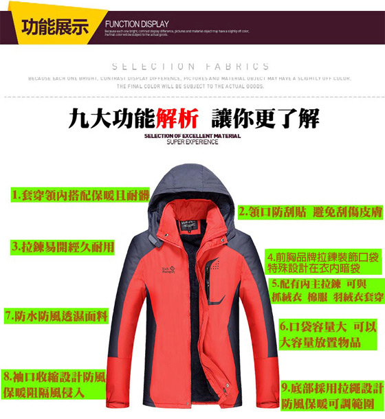 冷的像冰宮,你卻暖的像火爐 ![]() 當上地球的霸主 人,之所以能征服世界各地,就因為科技的力量,讓我們恆溫的身體能抵抗寒冬、對付潮濕,一件高機能外套,滿足你欲登至高峰、盡情享受戶外樂趣的決心! ![]() 集多項機能與一身 ‧防水性極佳,暴雨也能保持一身輕盈 ‧透氣性十足,滑雪、攀登都舒爽宜人 ‧保暖性材質,360度循環鎖溫,阻隔冷空氣侵襲 ‧防風性面料,高密度防風設計,登至再高也吹不熄你的熱情 ![]() ![]() ![]() ![]() ![]() ![]() ![]() ![]() ![]() ![]() ![]() ![]() ![]() ![]() ![]() ![]() ![]() ![]() 商品說明 商品名稱:加絨男女款防風防水保暖高機能外套 男款 紅色 藍色 軍綠 黑色 尺寸:XL/XXL/XXXL ![]() 女款 紅色 玫紅 紫色 藍色 尺寸:XL/XXL/XXXL ![]() 防水透氣指數5001mm 面料Gore-Tex+奈米材質PU塗層+3層壓膠+絲絨 ※商品圖檔顏色因電腦螢幕設定差異會略有不同,以實際商品顏色為準。 ※商品為平放測量,可能會因某些因素產生些許誤差,誤差值在1~3公分上下為合理範圍 |