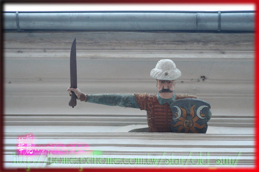 由於'生鏽的鐵丁'實在太遠,而此刻的歐洲,夜晚總是來的特別的早,只好轉回舊城區,抓緊最後的時光,並且按照地圖上景點的串連,穿梭在古城的巷弄間,一邊迷路,明明就已經是身陷五里霧中,卻又像識途老馬,又依序找到景點。由於是假日,許多店家都沒營業,包括皇家麵包彷,亦是大門深鎖,但街上還是滿滿的人潮。就在人潮擁擠之中,我們來到地圖指示的求愛武士的地點,卻一直找不到求愛武士在哪裡。而天色又漸漸暗了下來,就在即將放棄時。周圍有人對著天空指指點點,順著他們所指的方向望去,原來就在宮殿的屋簷上,趕緊拿出像機拍照留念,也順便作為今日第三張與大家分享。