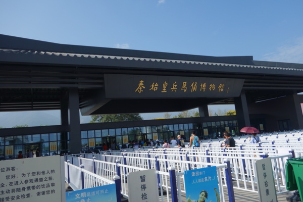 進入安檢門後.才正式進入秦始皇兵馬俑博物館景區.秦始皇兵馬俑博物館位於秦始皇帝陵東側1.5公里處.是秦始皇帝陵的陪葬坑.分別為一.二.三號兵馬俑坑.內有真人.真馬大小相似的陶俑.陶馬近8000件.有車兵.騎兵.步兵等不同兵種.排列井然有序.陶俑的形象各不相同.神態生動.被譽為世界第八奇蹟.在1979年.正式對外開放參觀.