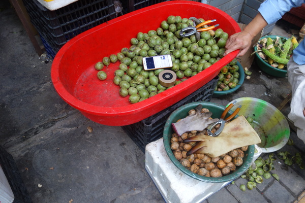 現在是核桃盛產期.幾乎每個水果攤.都有綠皮核桃.一有空.老闆就把核桃外皮去除.