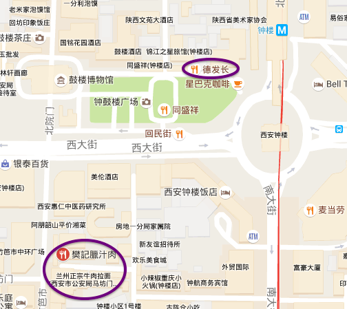 樊記臘汁肉店(竹笆市53號)及回民街的位置圖.