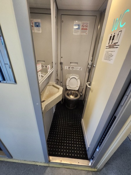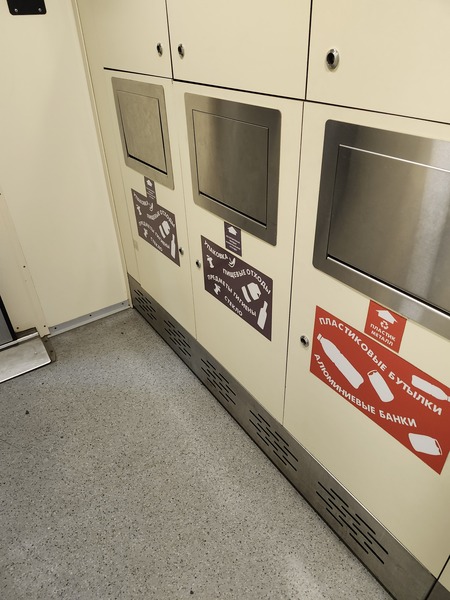 軟臥車廂另一端.設有分類垃圾箱.以及廁所.