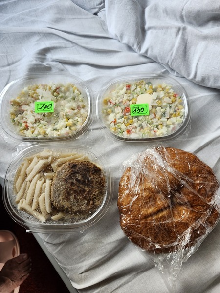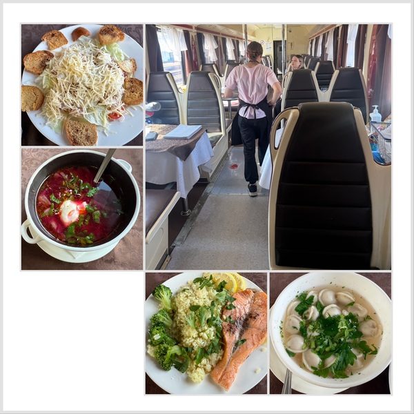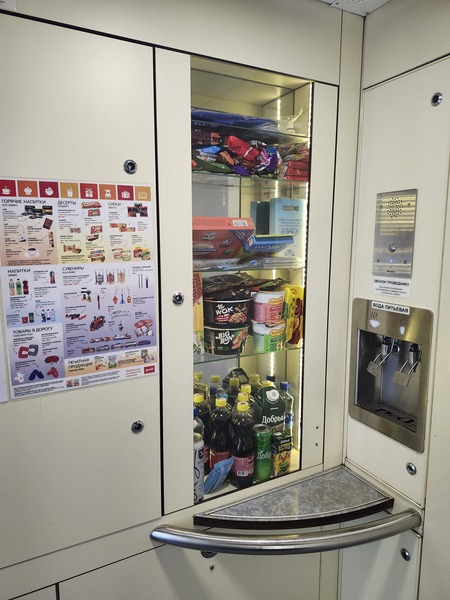 列車在途中大站.有幾十分鐘到最長80分鐘的休息.隨車服務員會告知上車時間.這是在車站旁餐館買的俄羅斯餐.沙拉110盧布及130盧布(台幣約50元).右下角是餡餅.便宜又好吃.我是看到餐車人員進這間餐館買.才跟隨進去買.拿回車上吃.大站的月台上.也有簡單熟食的販賣亭.