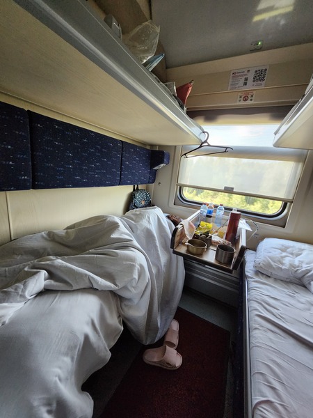 軟臥車廂.每間臥室.有上下舖4個床位.所以.每個人都要買上下舖2個床位.則每間臥室就只有夫妻2人.注意!列車奔馳期間.沒有網路.到車站暫停時.才收得到網路.聰明的人.會準備喜歡的書或事先下載的追劇.以打發時間.
