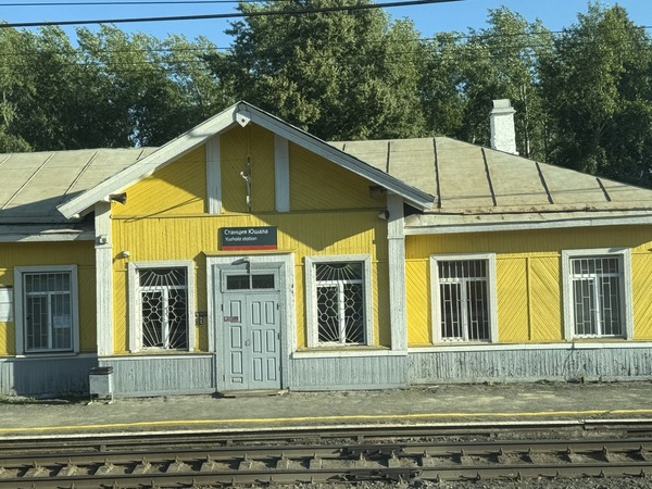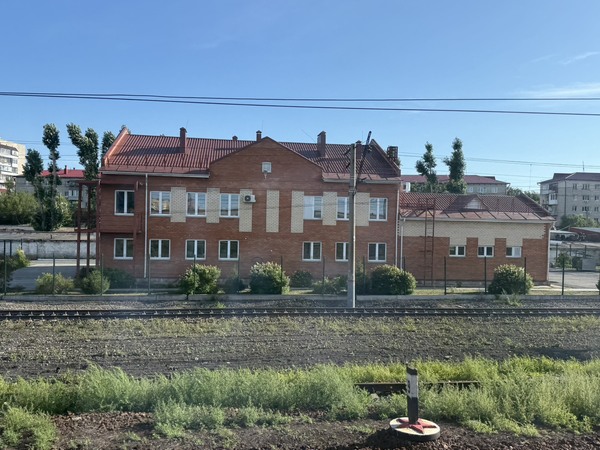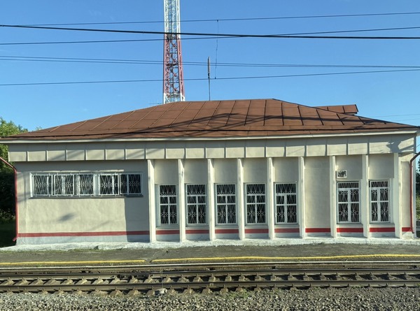 車站建築呈現獨特的俄羅斯古典建築風格.外牆為粉紅色.並飾有白色線條.深棕色木質門和裝飾性元素.