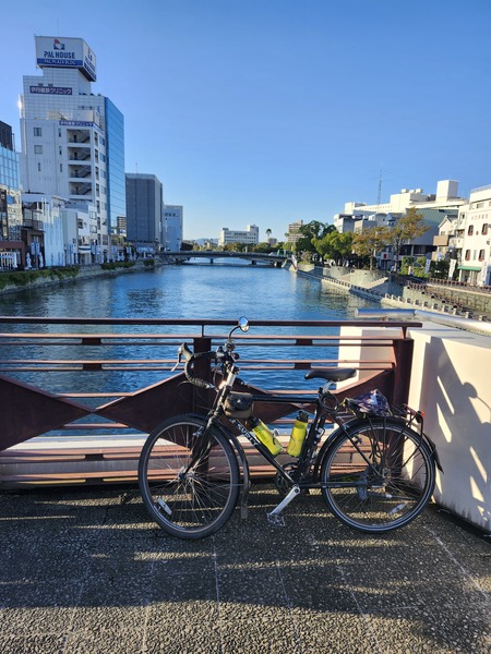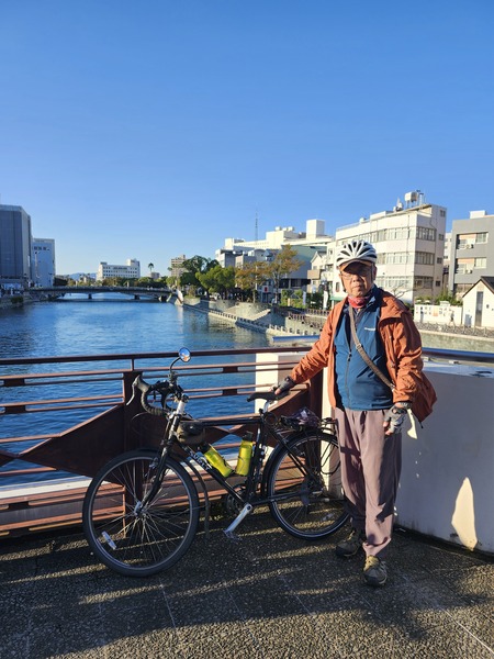 德島市中心的新町川.在跨越河川的單車橋.