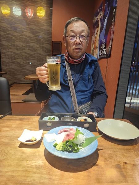 只得回到旅館旁的居酒屋.吃生魚片.喝生啤酒.