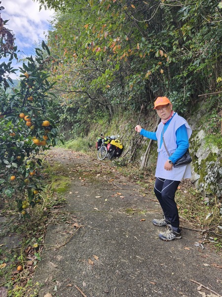 將單車及行李.置放在步道入口的叉路果園旁.徒步上山.