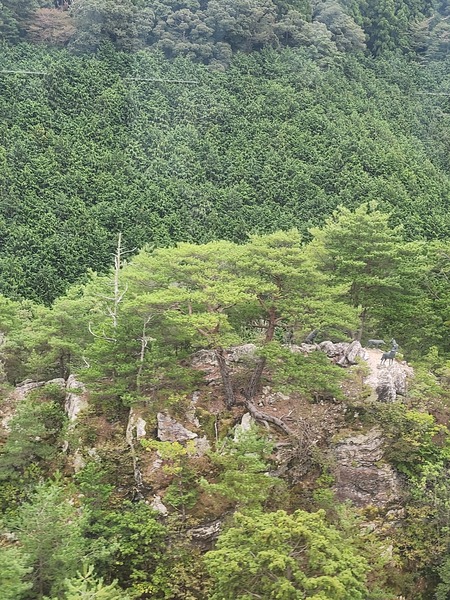 從纜車上.只看到山頂右方的三隻狼雕像.據說這是保護大師的.而.左方中間的大師雕像.被樹木擋到.未能清楚看到.