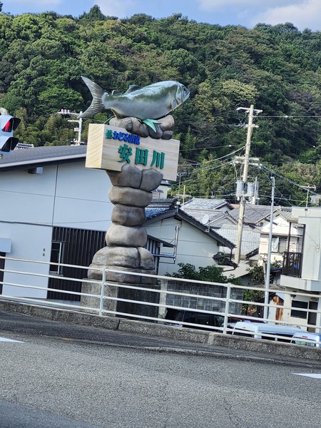 從奈半利町吃完可口便當後.55號國道續行.安田川大鱒魚雕像.