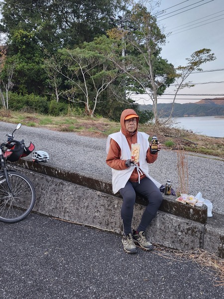 找個空曠的地方吃早餐.溫熱的咖啡.好喝.背後是[浦之內灣]的內海.