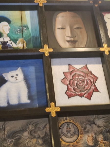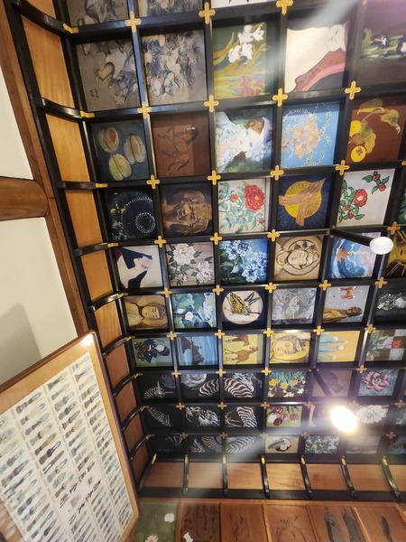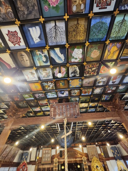本堂內側的格子天花板畫.是寺院亮點.建於1978年.天花板裝飾著從全國各地公開募集過來的風花雪月和諸佛菩薩圖等575幅畫作.